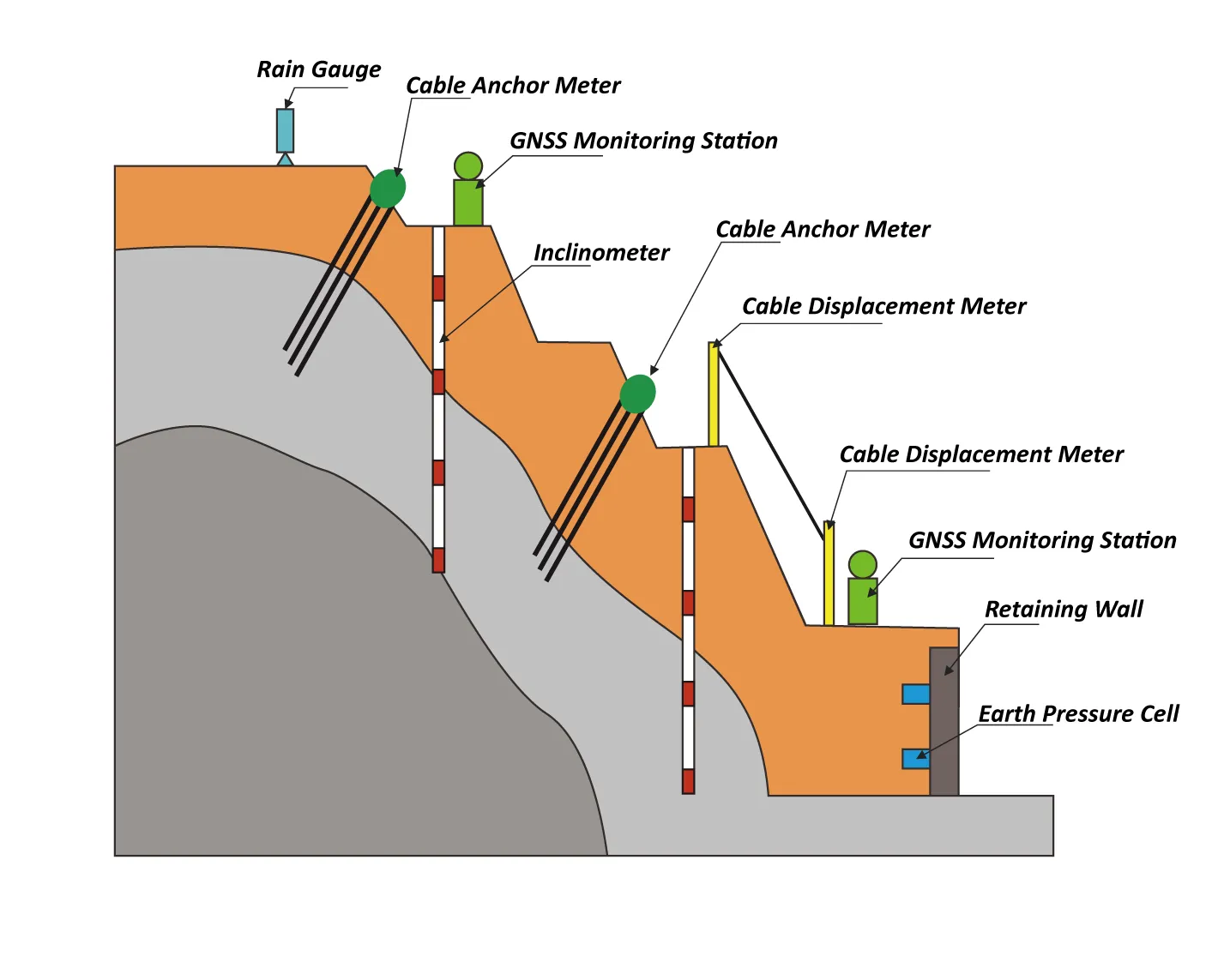 Deep displacement monitoring, surface displacement, anchor cable monitoring, rainfall monitoring,groundwater level monitoring, audible and visual alarm, etc.