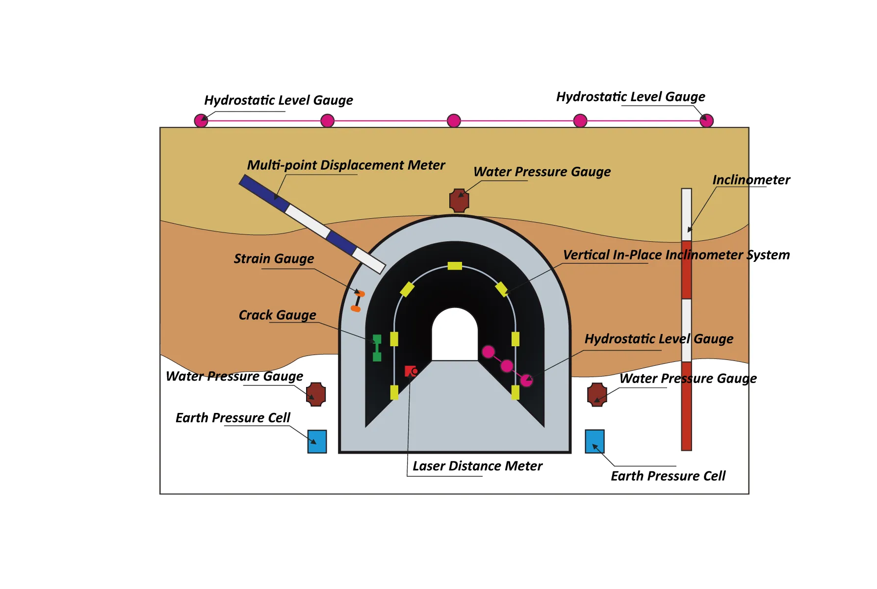 Tunnel settlement, convergence monitoring, tunnel crack, structural strain monitoring, etc.
